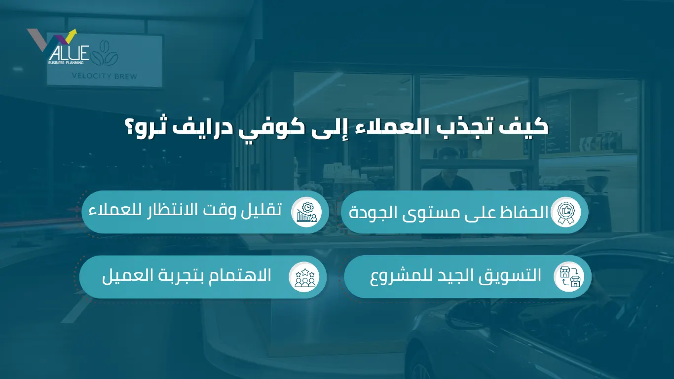 لجذب العملاء إلى كوفي درايف ثرو، يحتاج المشروع إلى استراتيجيات تسويقية فعالة وتجربة مميزة تضمن تكرار الزيارة. اليك مجموعة من التوصيات لتحقيق ذلك.